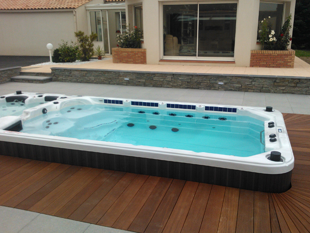 • Buses : 51 / Jets : 71 • Dim : 235 x 235 x 92 cm • Nbre places : 6 (2 allongées) • Habillage : jupe résine • Coque acrylique renforcé poly.